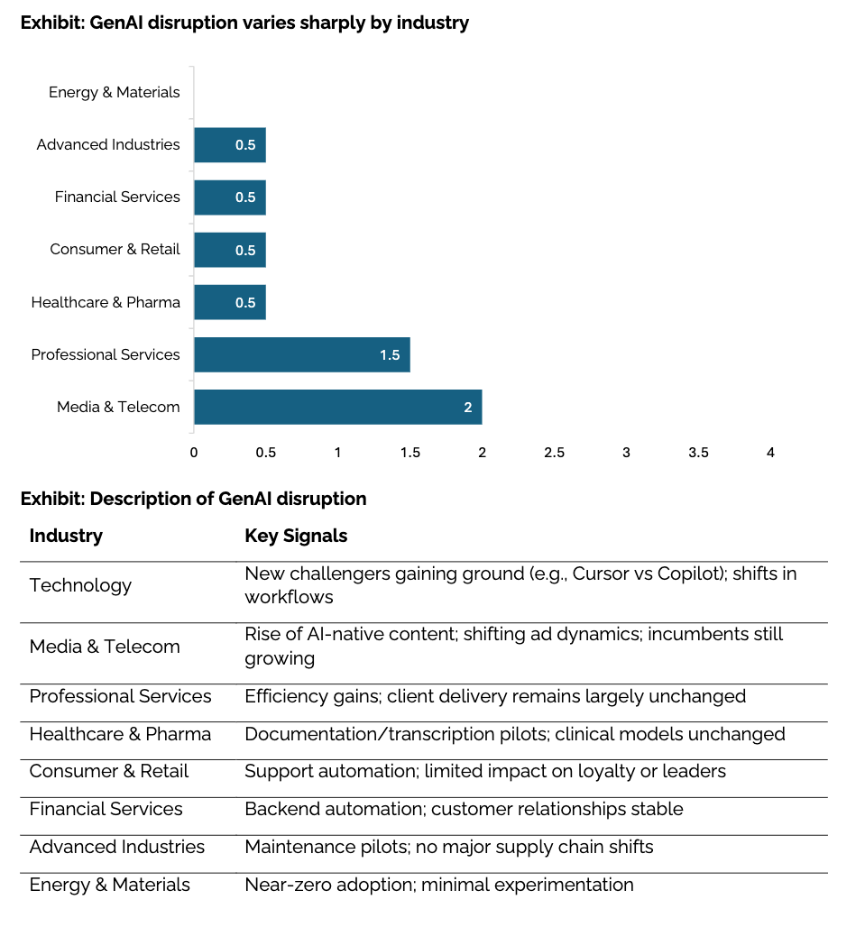 There is limited disruption, with only two of eight major sectors showing meaningful structural change —The MIT Project NANDA (pg. 3).