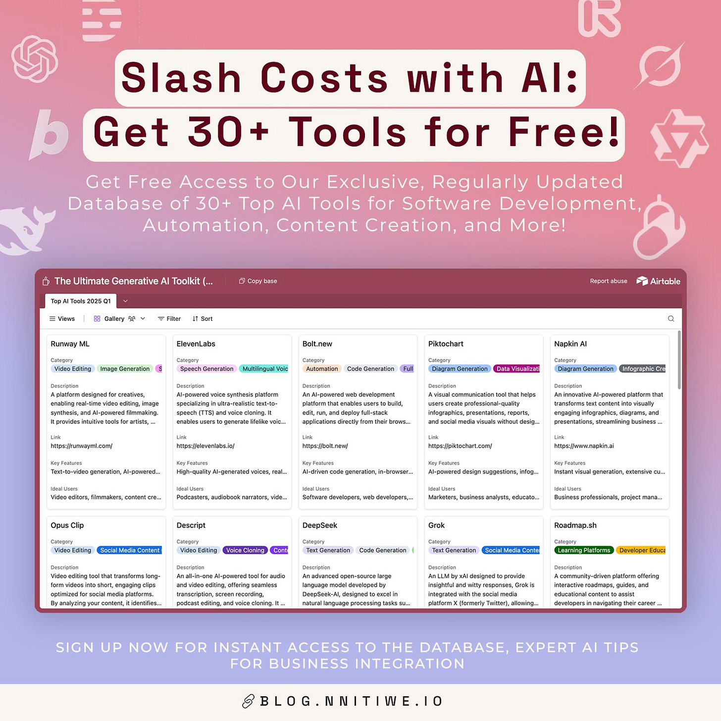 As a valued subscriber to Nnitiwe's AI Blog, you deserve better. That’s why I’ve poured time into curating a database of over 30 AI tools for 2025 that actually work, designed to optimize your business processes or fuel your technical projects.