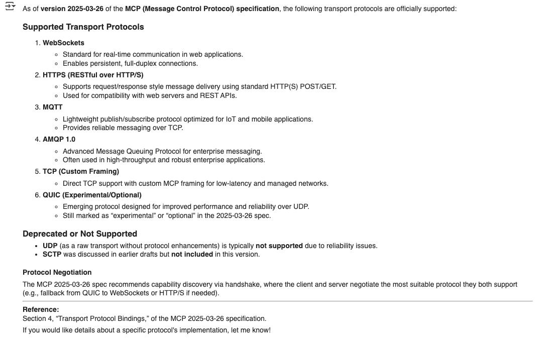 For something niche, like “What transport protocols are supported in the 2025-03-26 version of the MCP spec?”: