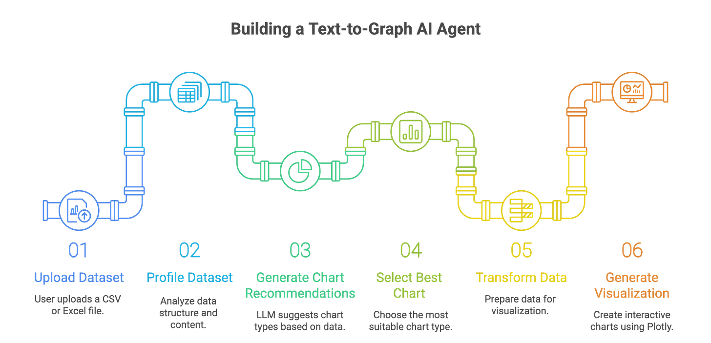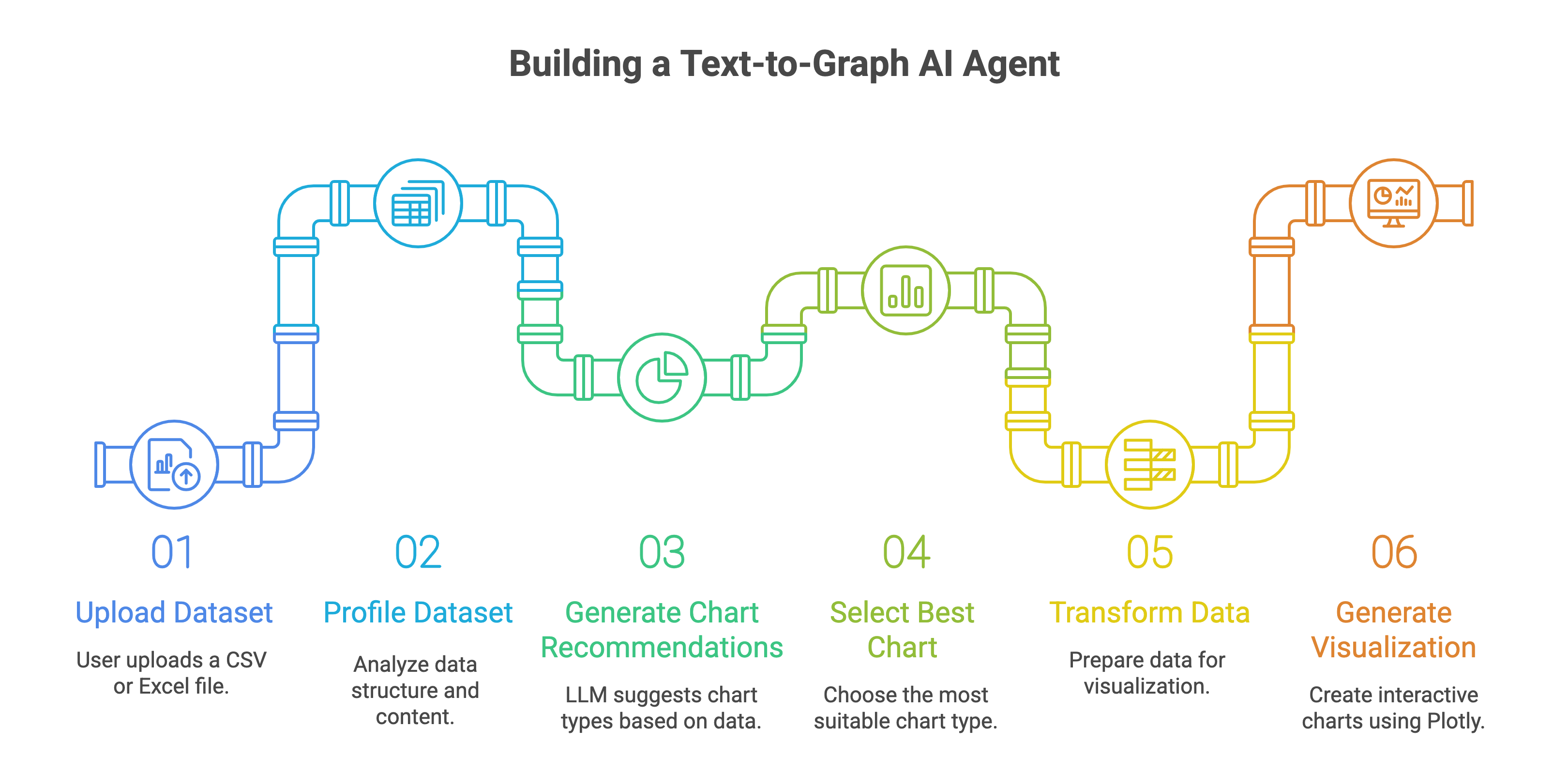 One such application is a Text-to-Graph AI Agent, a tool that takes structured data, such as a CSV file, processes user queries in natural language, performs sophisticated data analysis, and generates insightful visualizations.