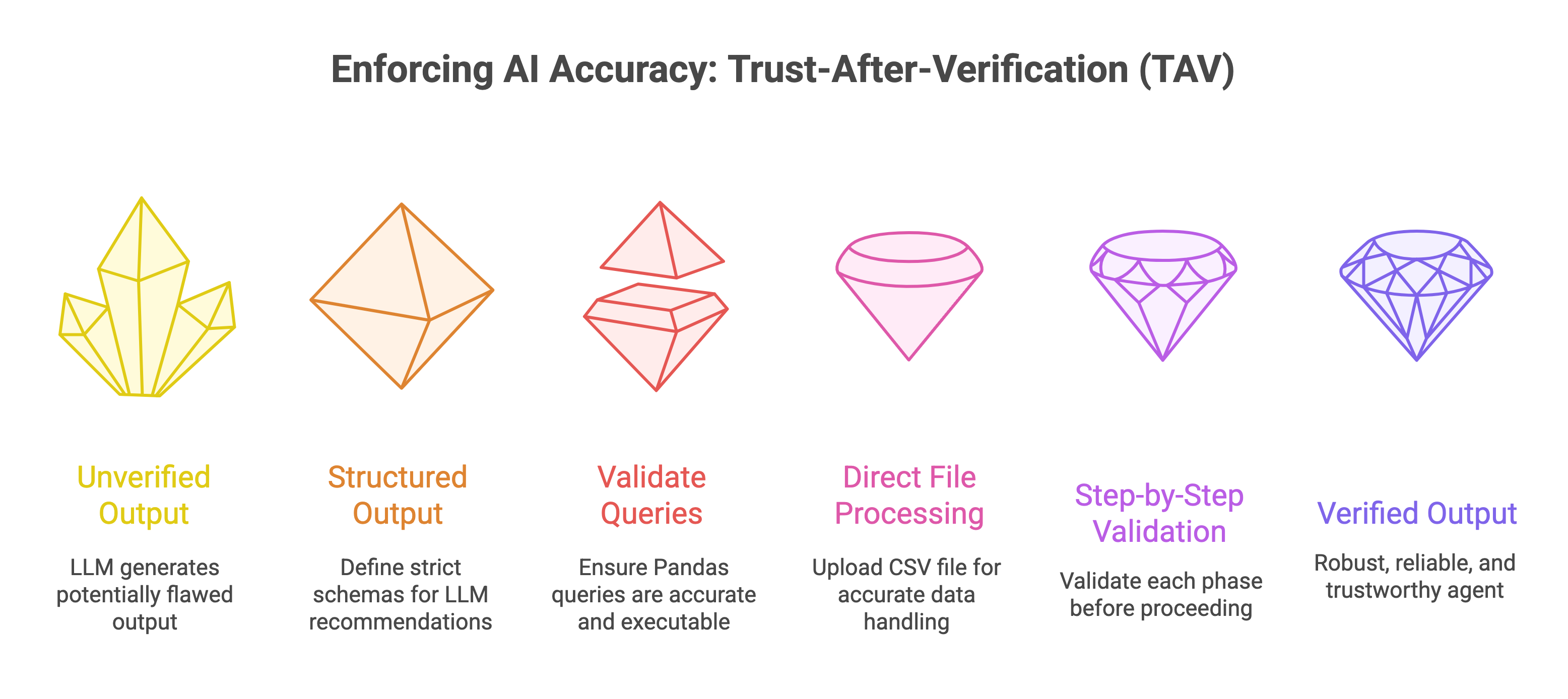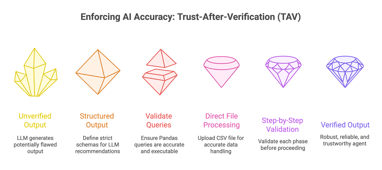 To make our agent reliable, we are adopting the Trust-After-Verification (TAV) principle. TAV assumes that the LLM’s outputs may contain errors or hallucinations and validates each step before proceeding.