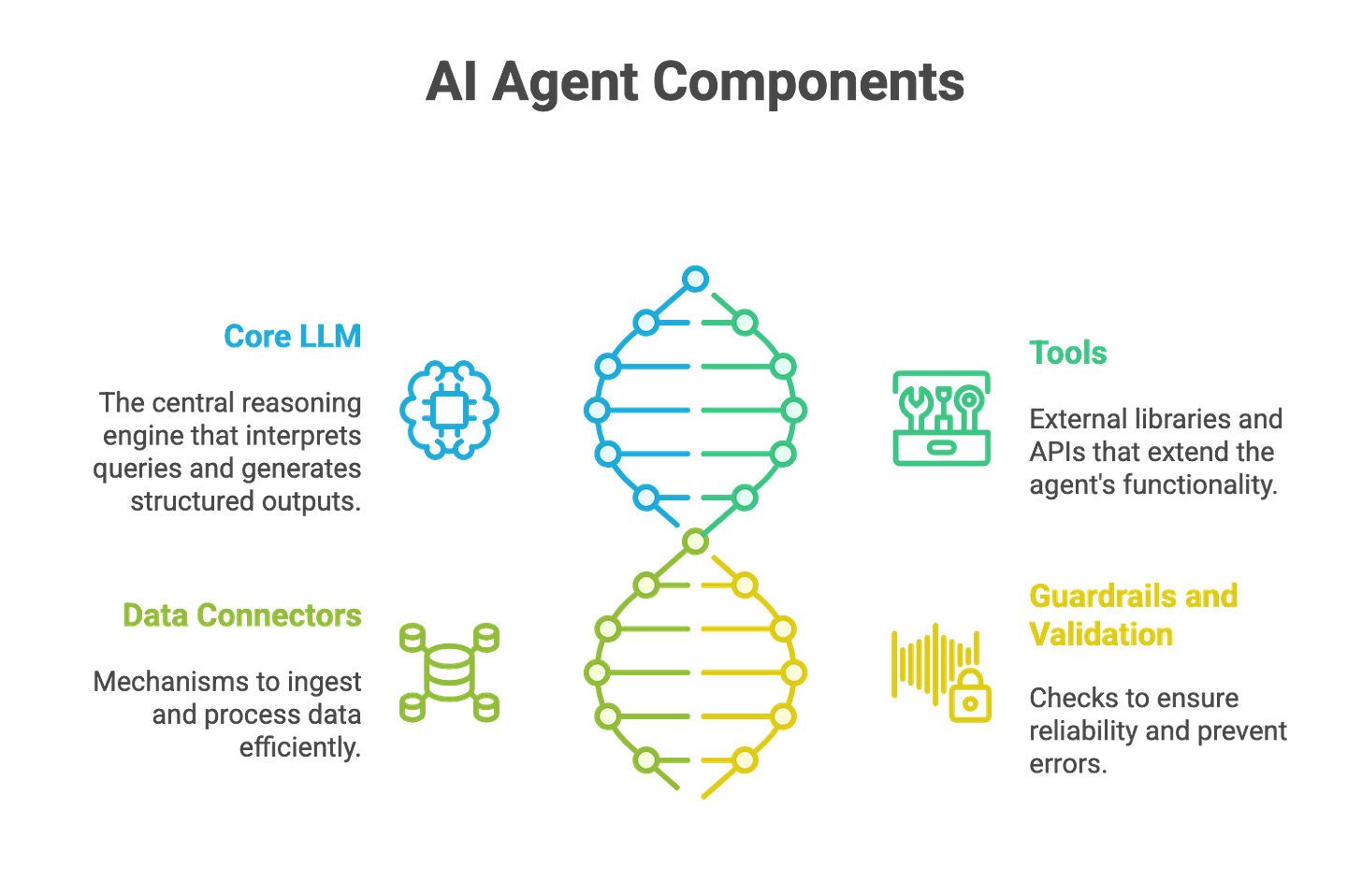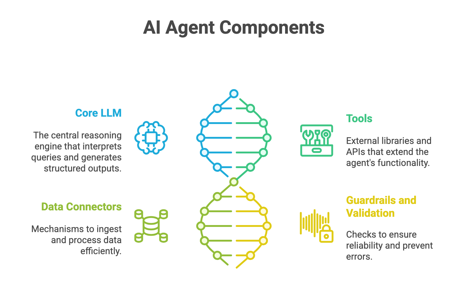 Data Connectors: These are mechanisms to ingest and process data, such as reading CSV files into a Pandas DataFrame or uploading files to OpenAI’s API. They ensure the agent can access and manipulate structured data efficiently.