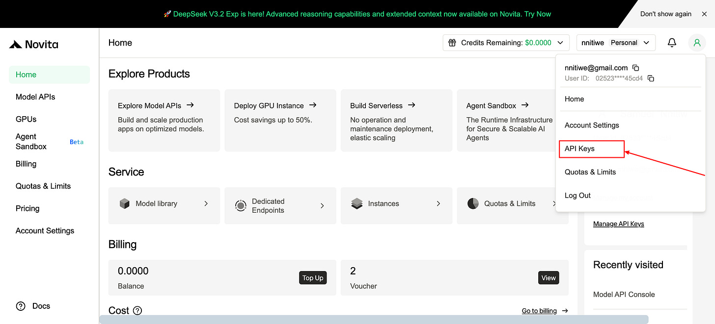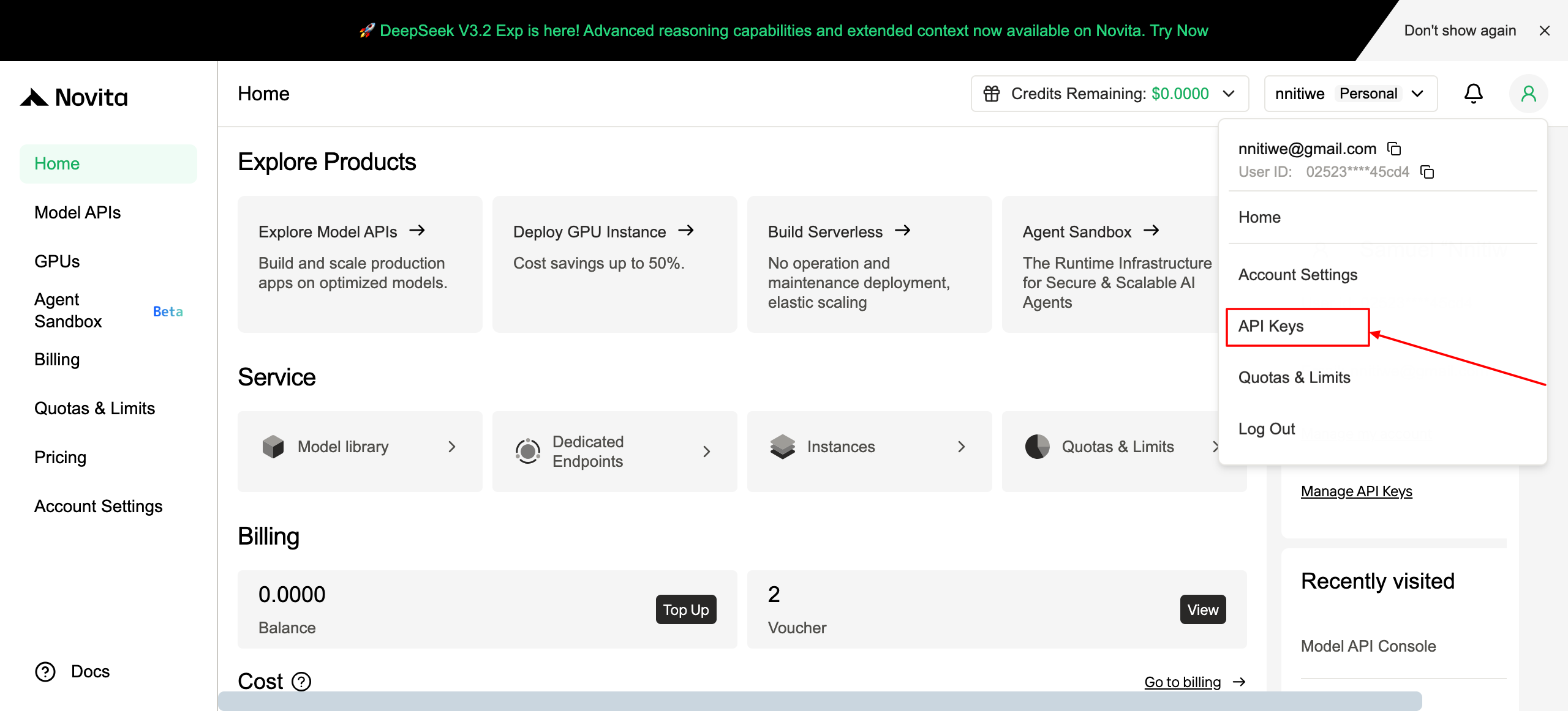 Sign up on a platform like Novita AI to get an API key, which authenticates your requests.